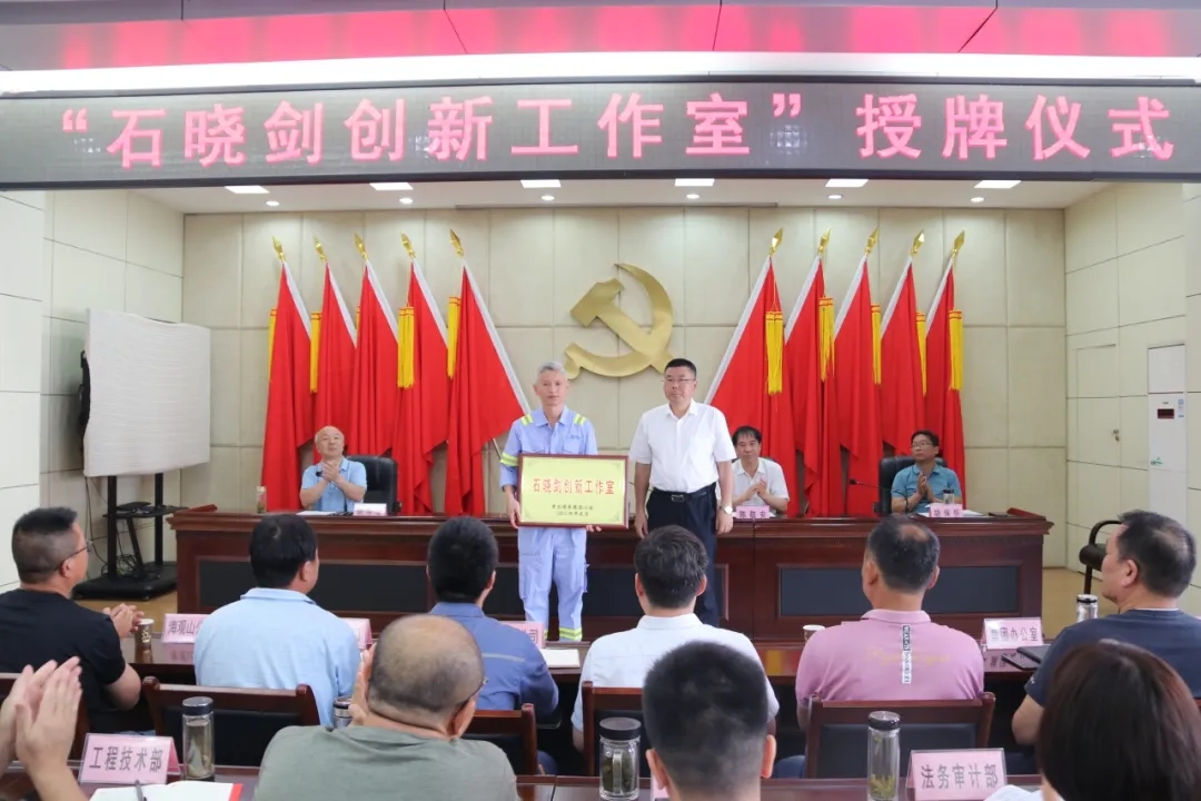 三樓會(huì)議室座無虛席,公司領(lǐng)導(dǎo)班子,機(jī)關(guān)部室負(fù)責(zé)人、基層單位分管領(lǐng)導(dǎo)及技術(shù)骨干、職工代表等40余人共同見證授牌時(shí)刻。湖北省首席工人技師、公司首席電氣工程師石曉劍進(jìn)行表態(tài)發(fā)言,公司黨委書記、董事長(zhǎng)、總經(jīng)理余曦親自將“石曉劍創(chuàng)新工作室”銅牌頒授到石曉劍手上。